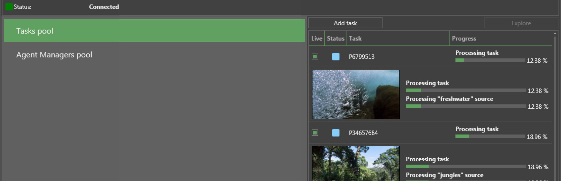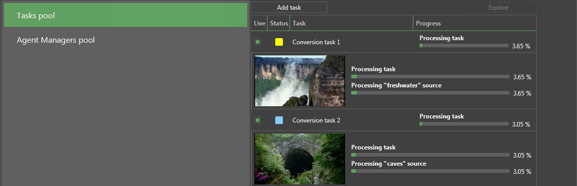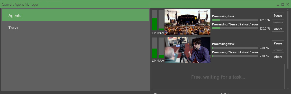 Cinegy Convert provides rich feedback on the processes being performed and statuses of every single node of the processing network. Information can be taken from the central coordination service providing the general overview on the system health or directly from the processing nodes including live feedback on tasks progress including video preview when required. Extensive logs, with configurable log levels, provide additional information about when, where and what tasks were performed by each job server.