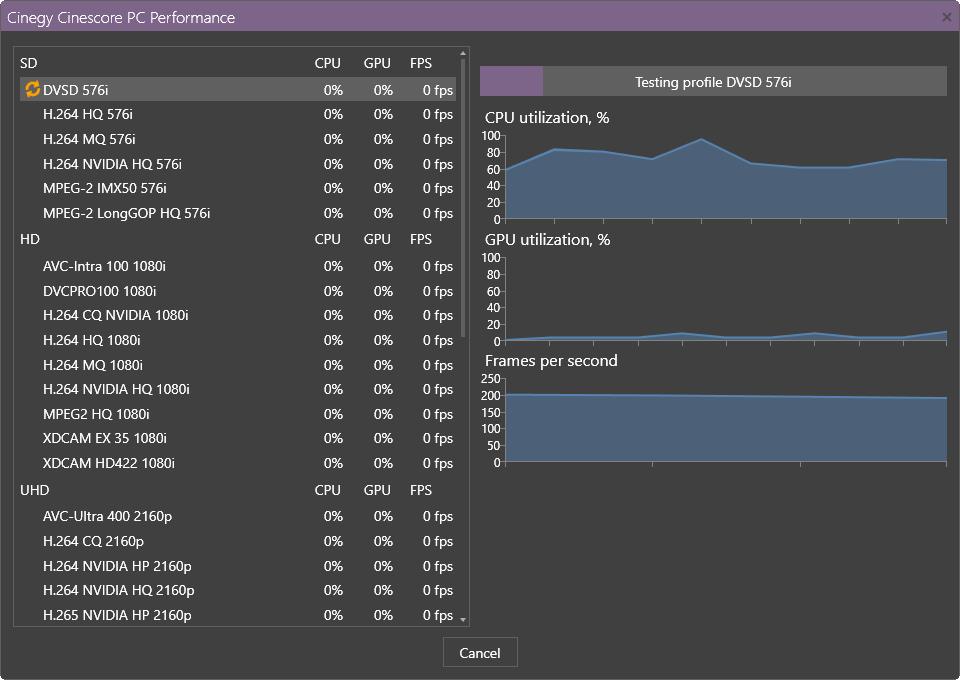 The move from proprietary video hardware to commercial-off-the-shelf (COTS) has changed the media and broadcast industry. Commodity machines powered by Intel processors and equipped with GPUs for graphics and compute acceleration are at the heart of modern video and broadcast systems. There are also many benchmarking tools that provide a general idea of the system performance of a system and that allow its comparison with other systems. In stark contrast the broadcast and media industry is largely fact free. None of the existing IT benchmarks have direct relevance to the broadcast and media industry. The main payload of broadcast and media is video. Video is getting encoded, decoded, transcoded by capture, edit, graphics, effects, export or streaming tools. Cinegy Cinescore covers a fair number of commonly used formats and codecs and measures the encoding speed as well as the system load for doing that for the different target resolutions - SD, HD, UHD and 8K.