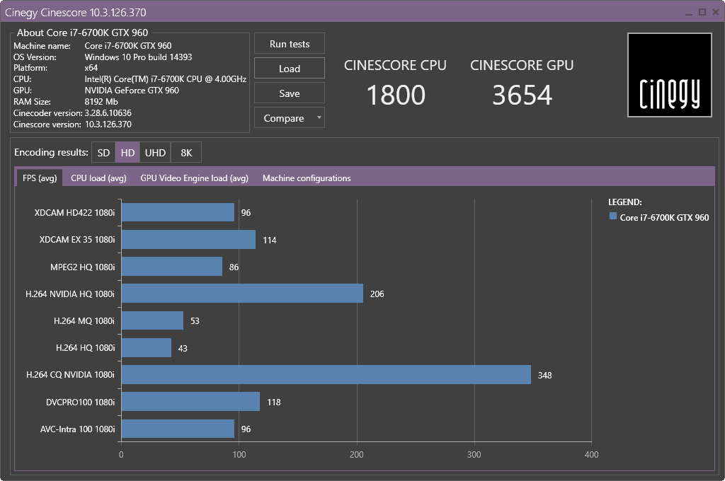 The measuring results are compounded into system performance scores – one for CPU performance and one for GPU performance (currently NVIDIA only). These are the Cinegy Cinescore numbers for CPU or GPU. The Cinegy Cinescore numbers make it very easy to compare systems and to judge whether a given machine is powerful enough for a certain task or what throughput to expect.