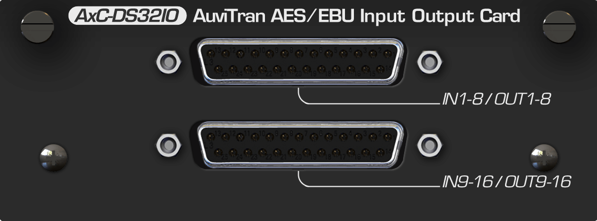 AxC-DS32IO features eight stereo AES/EBU digital inputs plus eight stereo AES/EBU digital outputs on two D-Sub 25 pins connectors (four AES/EBU stereo inputs and stereo outputs on each D-Sub)